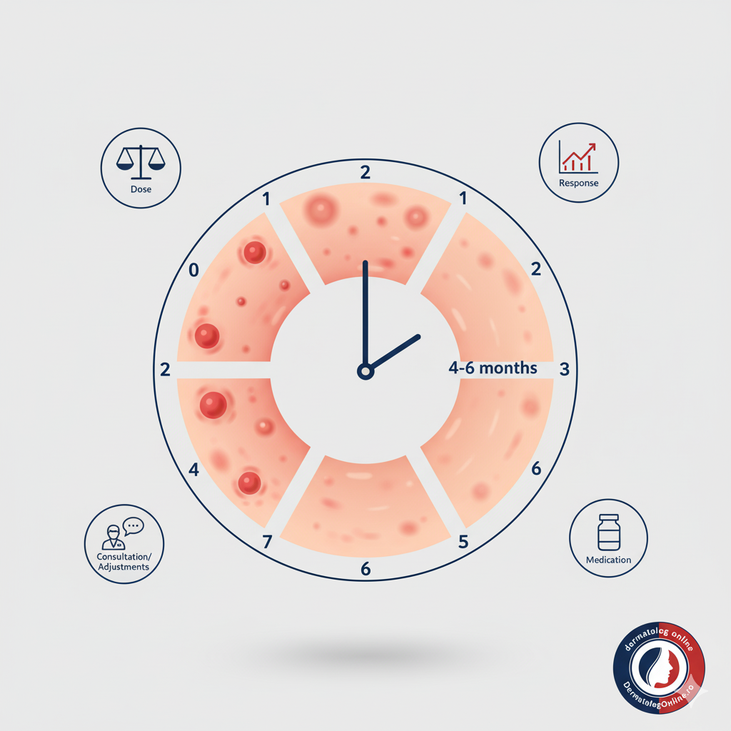 Durata tratamentului este personalizată, variind de obicei între 4 și 6 luni. Aceasta depinde de severitatea acneei, răspunsul individual și atingerea unei doze cumulative totale, esențială pentru prevenirea recidivelor pe termen lung.