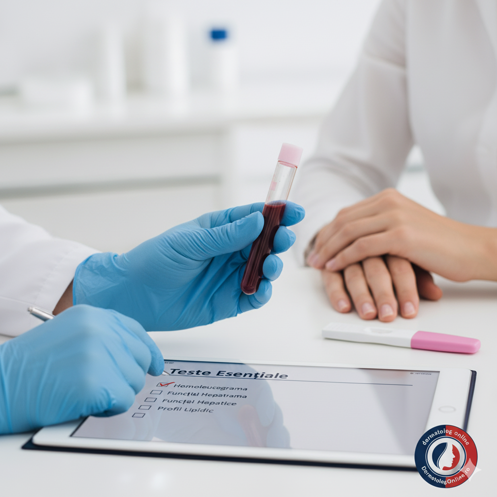 Înainte de tratament și lunar pe parcursul acestuia, sunt obligatorii hemoleucograma completă, funcțiile hepatice (TGO, TGP), profilul lipidic (trigliceride, colesterol) și, pentru femeile fertile, testul de sarcină. Acestea asigură monitorizarea siguranței și eficacității tratamentului.