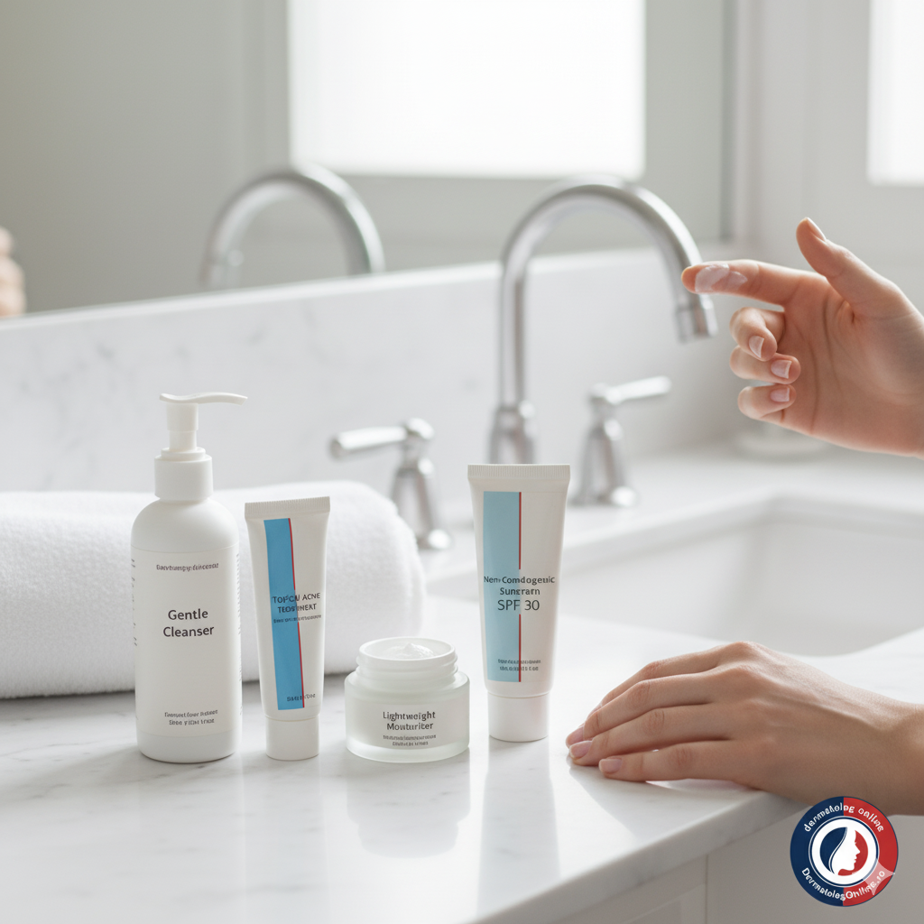 O rutină de îngrijire a pielii bine structurată este crucială pentru a susține tratamentul medical și a preveni noi erupții. Alegeți produse non-comedogenice, blânde și special formulate pentru tenul acneic.