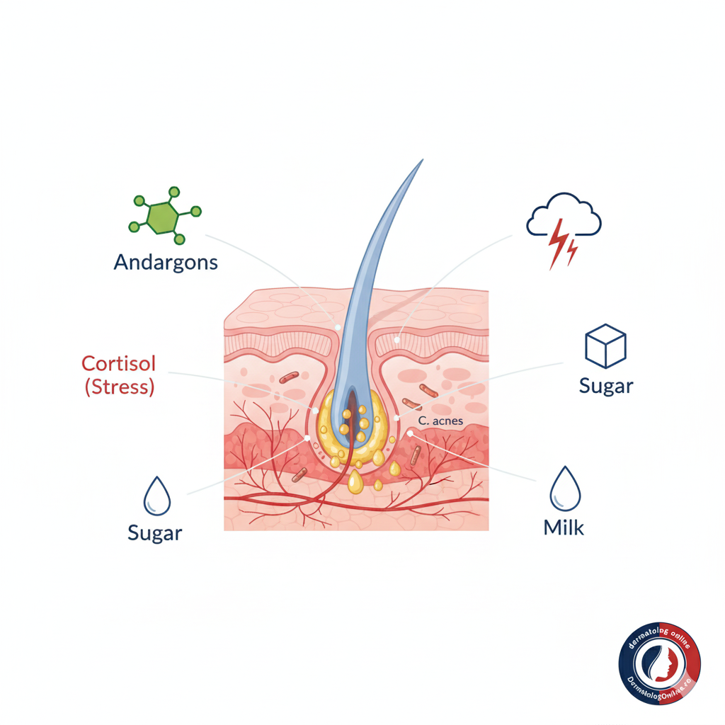 Alți factori care contribuie includ stresul cronic (care poate influența nivelurile de cortizol și androgeni), dieta (există o legătură între alimente și acnee, în special cele cu indice glicemic ridicat și lactate) și predispoziția genetică.